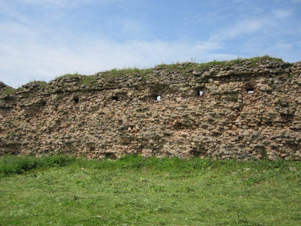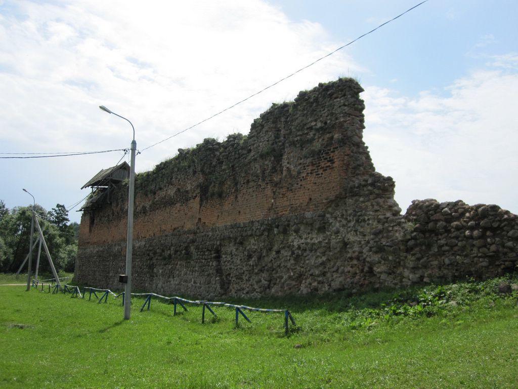 Форма неправильной трапеции была выбрана сообразно направлению нападения. Чаще всего осада угрожала северной стене. Ее длина достигает 85 м (не учитывая стену Княжеской башни), восточная, самая длинная - 108,6 м, южная - 71,4 м и западная - 97,3 м. Толщина замковых стен доходит до 2,8 м. Фундамент толщиной 2 метра выполнен из камней среднего размера, имеет цоколь в 30 сантиметров, и лежит на «подушке» из жердей и веток (использовались дуб и ель). Камень в замковых стенах использовался до высоты 4 м. Далее (только внешняя сторона) идет кирпичная кладка толщиной 65-70 см. До разрушения замок имел стены высотой 12-13 м. По всей их длине, на высоте 10 м, проходила боевая галерея из дерева. Стрельба защитниками замка велась через бойницы, проложенные с промежутком в 2,4 м.