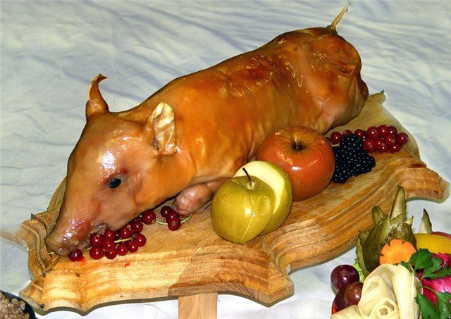 Приготовление. Тушку поросенка опалить на огне, тщательно вычистить и вымыть. Приготовить рассыпчатую гречневую кашу, перемешать ее с мелко нарезанными кусочками шпика и репчатым луком, пассерованными до светло-золотистого цвета. Тушку начинить, зашить, положить на противень, хорошо смазанный топленым салом, и поставить в печь или духовку. Во время жарения тушку периодически переворачивать, понемногу добавляя жир или воду. Перед подачей на стол тушку разрезать на части, удалить нитки, полить жиром.