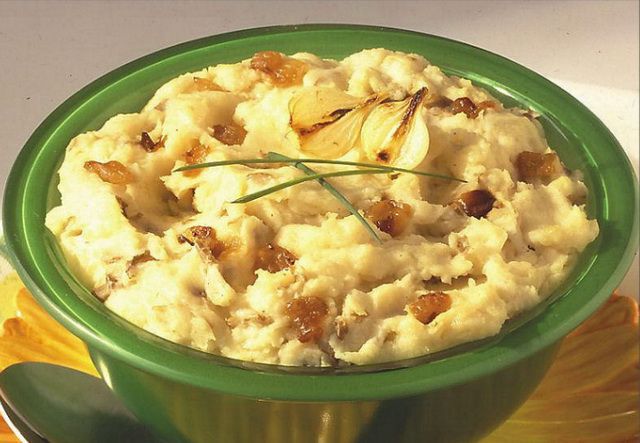Приготовление. Картофель отварить в подсоленной воде, немного подсушить и истолочь. Мелко нарезанные кусочки соленого свиного сала и репчатого лука поджарить и перемешать с картофелем.